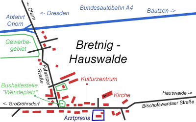 Sie fahren mit einem Bus der Linie R304, R305 oder R306 des Verkehrsverbundes Oberelbe bis zur Haltestelle "Wendeplatz" Bretnig-Hauswalde. Anschließend laufen Sie ca. 250m auf der Bischofswerdaer Straße Richtung Hauswalde.